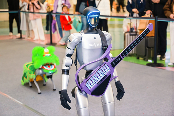 上午9時(shí),T4國(guó)內(nèi)出發(fā)安檢后中庭響起舒緩的科技感音樂。宇樹G1機(jī)器人開啟“預(yù)熱互動(dòng)”,在人群中自如穿梭,并與旅客友好握手,引得過往旅客紛紛駐足。隨后,機(jī)器人佩戴智能吉他穩(wěn)步登臺(tái),奏響經(jīng)典流行曲目,引來(lái)現(xiàn)場(chǎng)不少旅客朋友自發(fā)鼓掌歡呼。現(xiàn)場(chǎng)一同亮相的還有數(shù)只扮成舞獅造型的宇樹機(jī)器狗,伴隨著激昂的鑼鼓聲,在舞臺(tái)中央靈活完成“采青”“翻騰”等經(jīng)典舞獅動(dòng)作,將千年非遺文化與仿生科技完美融合,贏得旅客陣陣驚嘆。