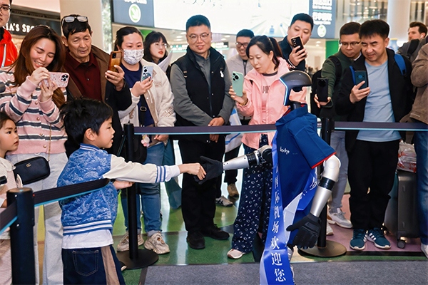 表演結(jié)束后,機(jī)器狗隊(duì)伍進(jìn)入“航站樓漫游模式”,以整齊的步伐一路巡游至T4北二指廊。往來(lái)旅客還能現(xiàn)場(chǎng)遙控機(jī)器狗完成特定任務(wù),深度參與互動(dòng)。浙江空港商業(yè)公司董事長(zhǎng)范穎瑛介紹道:“此次AI機(jī)器人音樂會(huì)拉開了杭州機(jī)場(chǎng)科技嘉年華第二季的序幕,也是我們?cè)谔剿魃虡I(yè)、服務(wù)與科技融合方面的又一次創(chuàng)新嘗試。后續(xù),我們將以新質(zhì)生產(chǎn)力推動(dòng)航旅變革,讓機(jī)場(chǎng)商業(yè)服務(wù)再升級(jí),旅客體驗(yàn)更美好。”