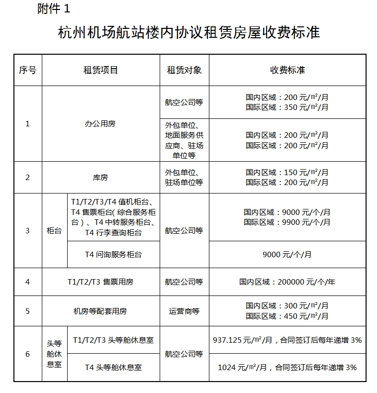 杭州機場航站樓外協議租賃房屋收費標準