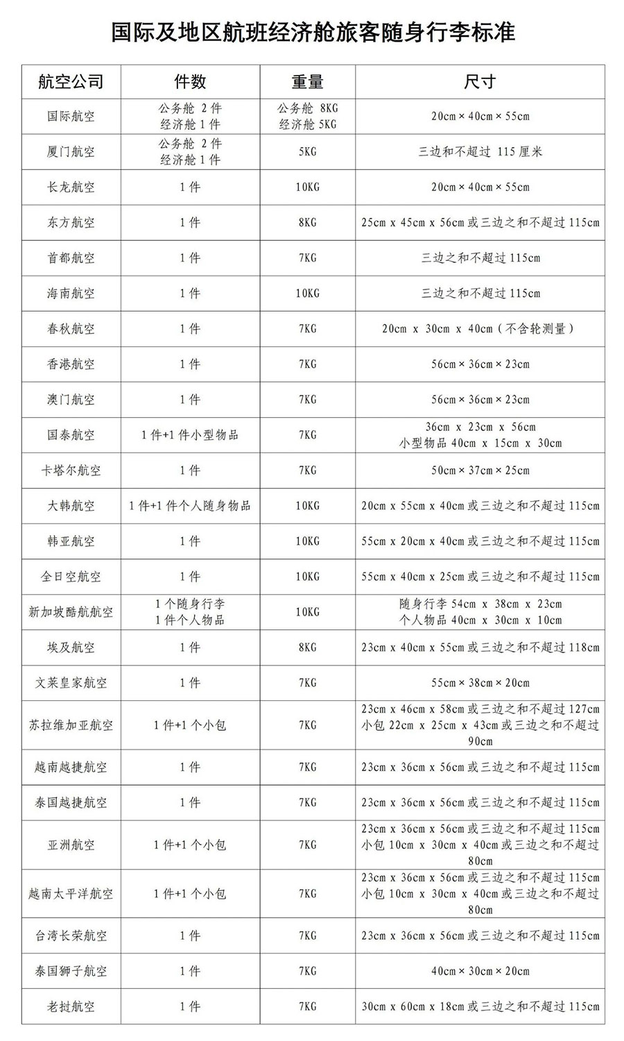 大家在購票網站購票時,應仔細查看所購機票分別包含的托運行李額度和手提行李額度,以便提前整理好行李。辦理行李托運時,請務必提前將充電寶、應急藥品、重要文件、貴重物品、易碎、易腐等物品取出并隨身攜帶。