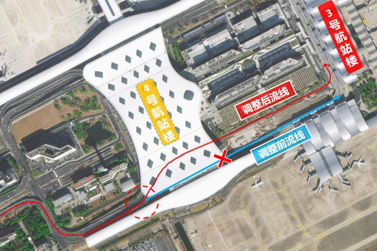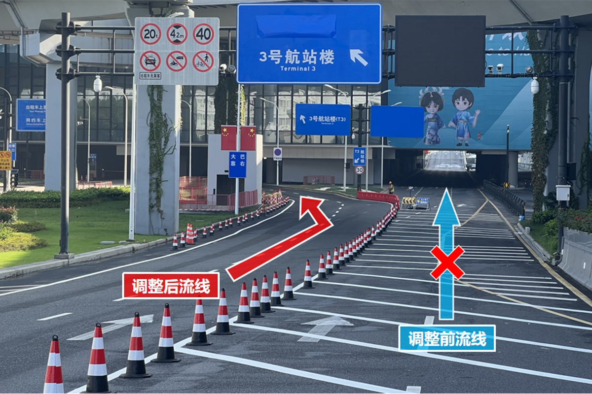 因機場高鐵建設施工需要,自2024年10月21日起,3號航站樓(T3)出發(fā)的旅客車行流線將進行調整,具體如下: